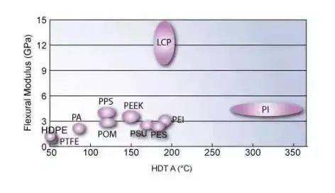 下圖比較了常用來替代金屬的聚合物材料的硬度和熱變形溫度: